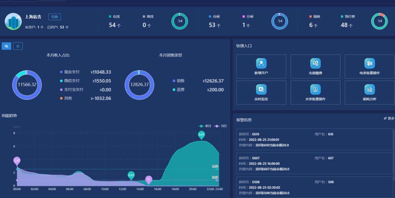 6)報表中心:提供售電、售水財務報表、用能報表、報警報表等查詢,本系統所有的報表及記錄查詢,都支持excel格式導出。