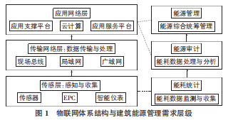 公共建筑能源管理系統包含了設置在建筑中不同位置的物聯網終端、物聯網能源管理平臺以及通信設施,而物聯網獨特的體系結構剛好可以對應滿足建筑能源管理系統的多層需求(見圖1)。