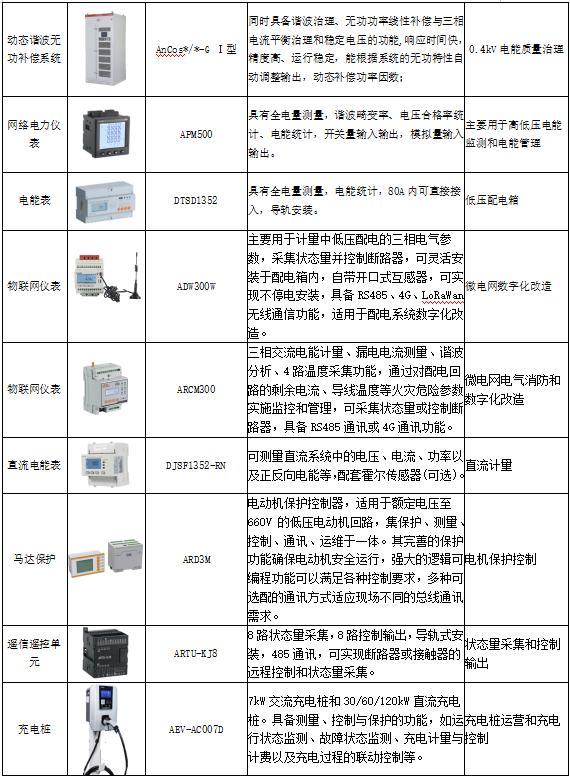 安科瑞針對(duì)企業(yè)微電網(wǎng)數(shù)字化系統(tǒng)除了軟件外,還具備現(xiàn)場(chǎng)傳感器、智能網(wǎng)關(guān)等設(shè)備,組成了完整的“云-邊-端”數(shù)字化體系,具體包括高低壓配電綜合保護(hù)和監(jiān)測(cè)產(chǎn)品、電能質(zhì)量在線監(jiān)測(cè)裝置、電能質(zhì)量治理、照明控制、新能源充電樁、電氣消防類解決方案等,可以為企業(yè)微電網(wǎng)數(shù)字化提供一站式服務(wù)能力,部分設(shè)備見表1。