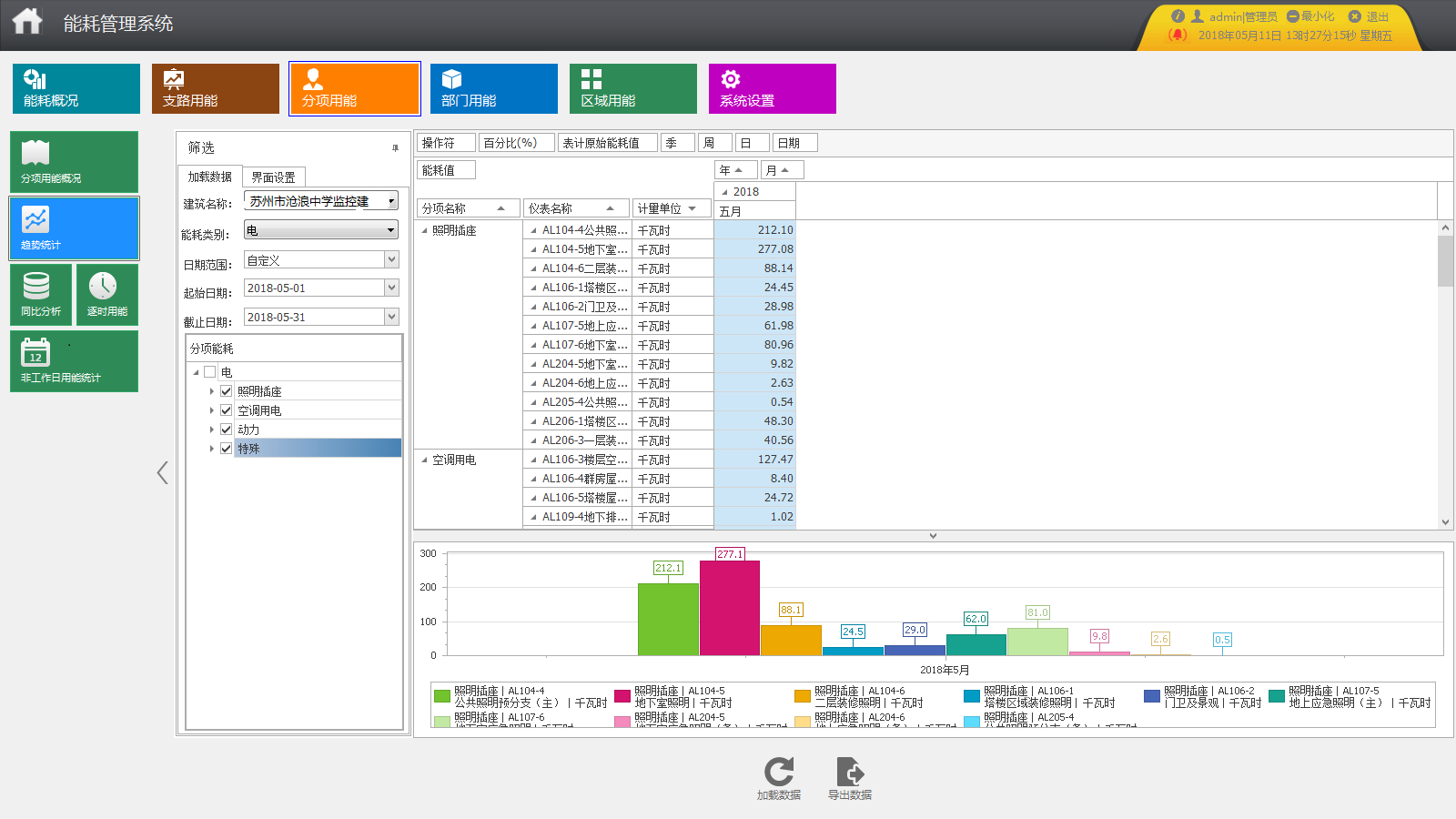 系統可以統計各分項某段時間內逐日、逐周、逐月、逐季、逐年用能。可查看分項中各支路用能趨勢,可根據已有的日期或者自定義時間進行查詢,統計數據可導出至Excel。