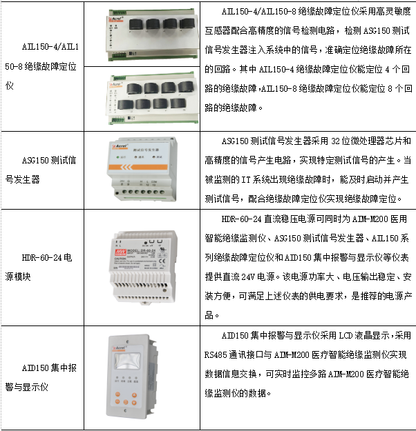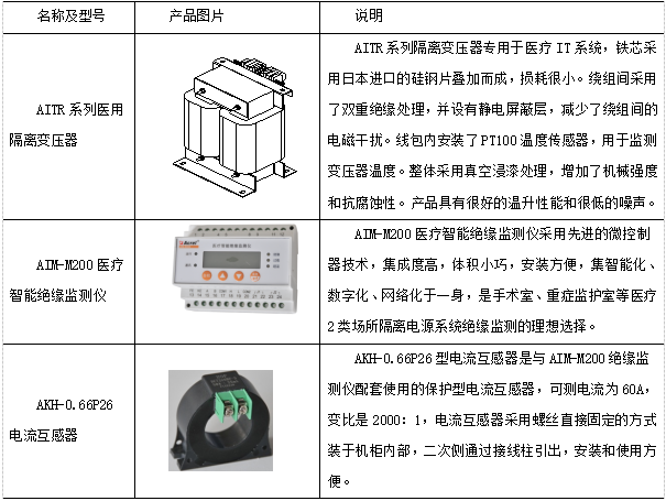 醫(yī)用IT系統(tǒng)絕緣監(jiān)測及故障定位產(chǎn)品(七件套)包括AITR系列醫(yī)用隔離變壓器、AIM-M200醫(yī)療智能絕緣監(jiān)測儀、AKH-0.66P26電流互感器、AIL150-4/AIL150-8絕緣故障定位儀、ASG150測試信號發(fā)生器、HDR-60-24電源模塊和AID150集中報警與顯示儀等,產(chǎn)品如表1所示。