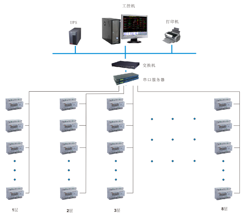 安科瑞Acrel-3200遠程預付費電能管理系統根據福安東百城實際情況進行組網設計,對樓層租戶加裝遠程預付費電度表,采用就地組網,在后臺服務器位置放置一臺采集器,遠程預付費電度表通過手拉手方式接入采集器。整體網絡結構如下圖所示:站控管理層、網絡通訊層和現場設備層。