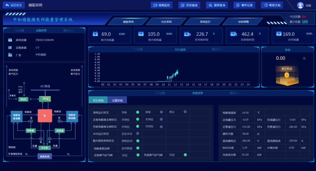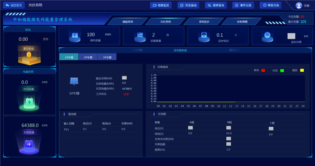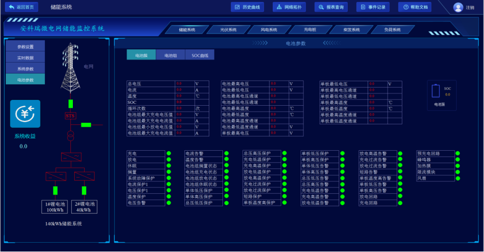 微電網(wǎng)能量管理系統(tǒng)是儲(chǔ)能系統(tǒng)與運(yùn)行人員聯(lián)系的主要方式,系統(tǒng)可提供重要參數(shù)的顯示和必要操作,包括儲(chǔ)能系統(tǒng)主要儲(chǔ)能裝機(jī)容量、單次充放電量與時(shí)間、SOC曲線、收益及儲(chǔ)能系統(tǒng)運(yùn)行狀態(tài)參數(shù),手動(dòng)和自動(dòng)控制,控制調(diào)節(jié)對(duì)象包括直流開關(guān)、各電壓等級(jí)的電動(dòng)操作開關(guān)、主要設(shè)備的啟動(dòng)退出、PCS功率設(shè)定、裝置運(yùn)行參數(shù)設(shè)定等。