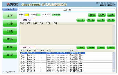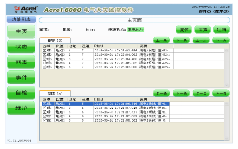 監控設備能接收多臺探測器的剩余電流、溫度信息,報警時發出聲、光報警信號,同時設備上紅色“報警”指示燈亮,顯示屏指示報警部位及報警類型,記錄報警時間,聲光報警一直保持,直至按設備的“復位”按鈕或觸摸屏的“復位”按鍵遠程對探測器實現復位。對于聲音報警信號也可以使用觸摸屏“消聲”按鍵手動消除。