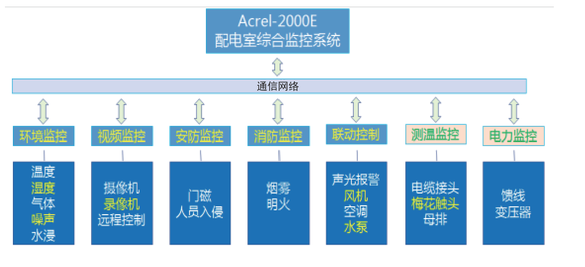 Acrel-2000E配電室綜合監(jiān)控系統(tǒng),可實現(xiàn)開關(guān)柜運行監(jiān)控、高壓開關(guān)柜帶電顯示、電流電壓等負載運行監(jiān)測、母線及電纜測溫監(jiān)測、環(huán)境溫濕度監(jiān)測、有害氣體監(jiān)測、安防監(jiān)控,可對燈光、風機、除濕機、空調(diào)控制等設備進行聯(lián)動控制。實現(xiàn)動力環(huán)境各數(shù)據(jù)的檢測與設備控制,優(yōu)化動力環(huán)境,避免運行環(huán)境的失控導致配電設備運行故障,保證維護人員安全,延長設備使用壽命,實現(xiàn)配電動力環(huán)境的分布式遠程管理。