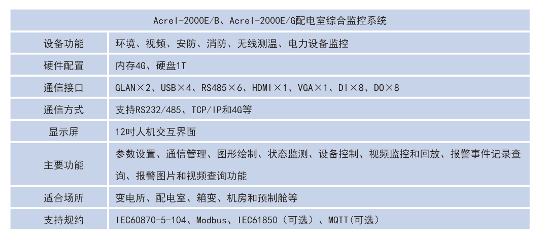 由于硬件資源以及系統(tǒng)軟件上的差別,Acrel-2000E/A作為針對變電所配電室的環(huán)境輔助監(jiān)控系統(tǒng),只對環(huán)境參量設備進行在線監(jiān)測;而Acrel-2000E/B與Acrel-2000E/G作為硬件資源豐富,系統(tǒng)功能更為強大的設備,可以配合我司無線測溫以及電力儀表進行在線監(jiān)測。