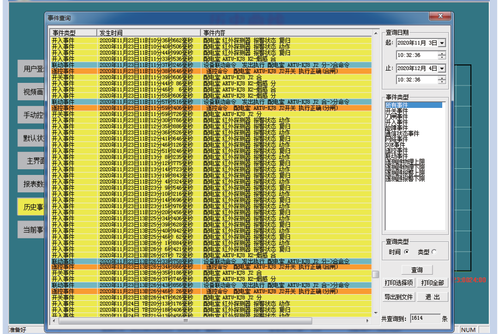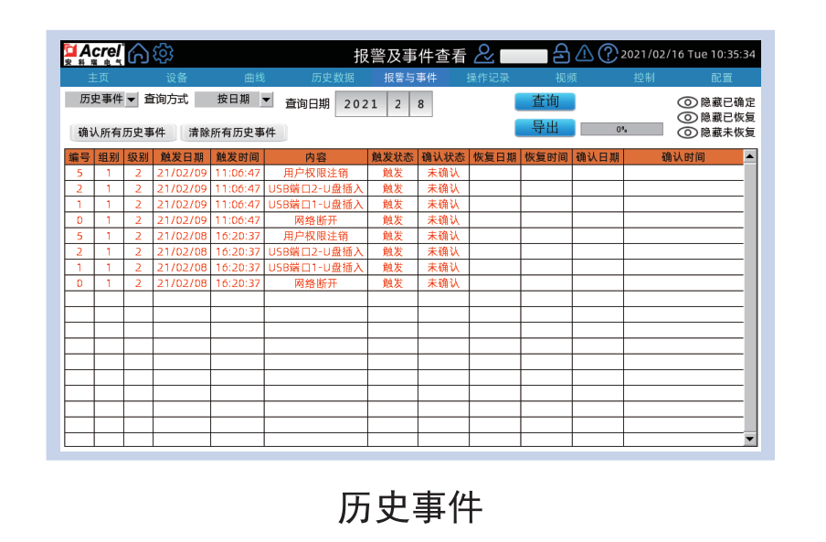 在“歷史事件”的界面,同“歷史數(shù)據(jù)”界面一樣,表格上方的查詢及導出按鈕分別提供相應的查詢和導出功能,并且可以根據(jù)所選擇的不同查詢方式進行不同方式的查詢功能。