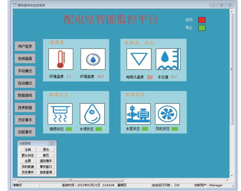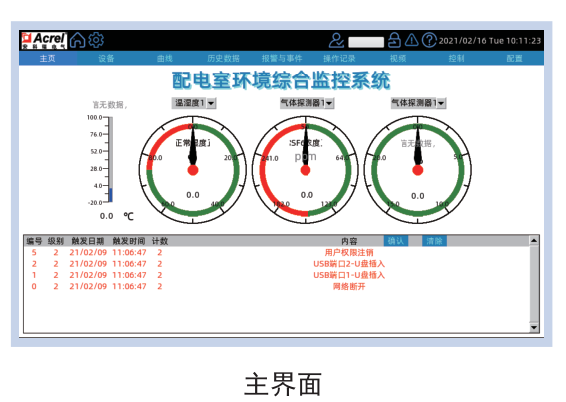 觸摸屏上電進入工作狀態(tài)后,默認為主界面,在此界面可觀察到配電室環(huán)境溫濕度、SF6氣體和O2濃度等監(jiān)測信息以及當前事件列表。